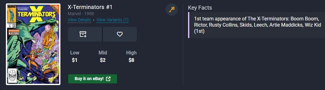1st team appearance of The X-Terminators: Boom Boom, Rictor, Rusty Collins, Skids, Leech, Artie Maddicks, Wiz Kid (1st)